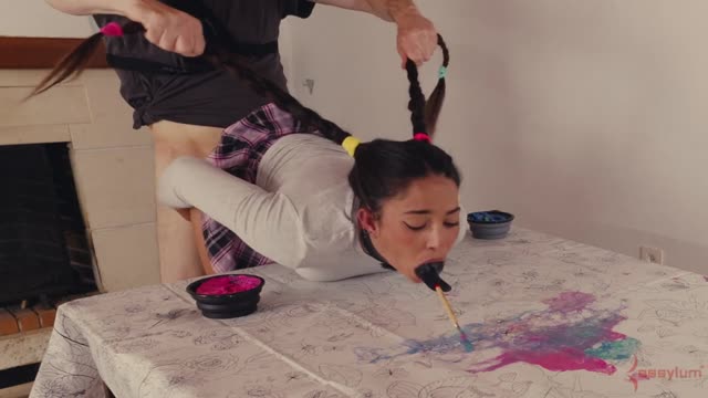 Tiny Sex slave Yhivi is bound with a Sybian on her clit, helpless, coming and deep throated!